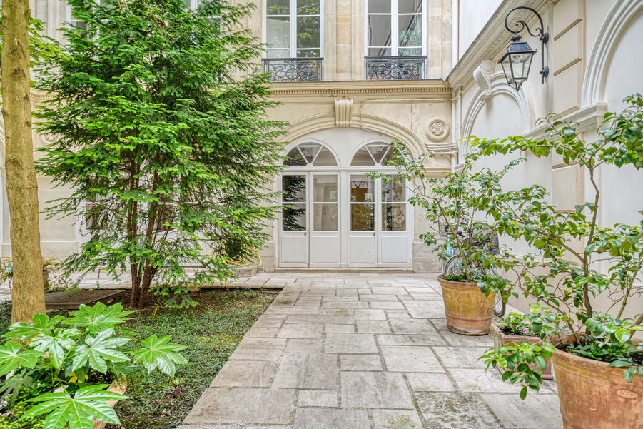 L'appartement bénéficie d'une vue apaisante sur une cour verdoyante, apportant une touche de nature en plein cœur de la ville.