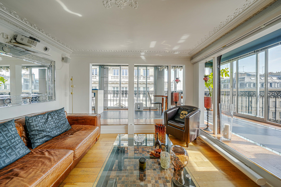 The loggia lounge is a bright and spacious space, decorated with 25 meters of corner bay window offering a sunny view of the famous Grands Boulevards of Paris, creating a unique and inspiring atmosphere.